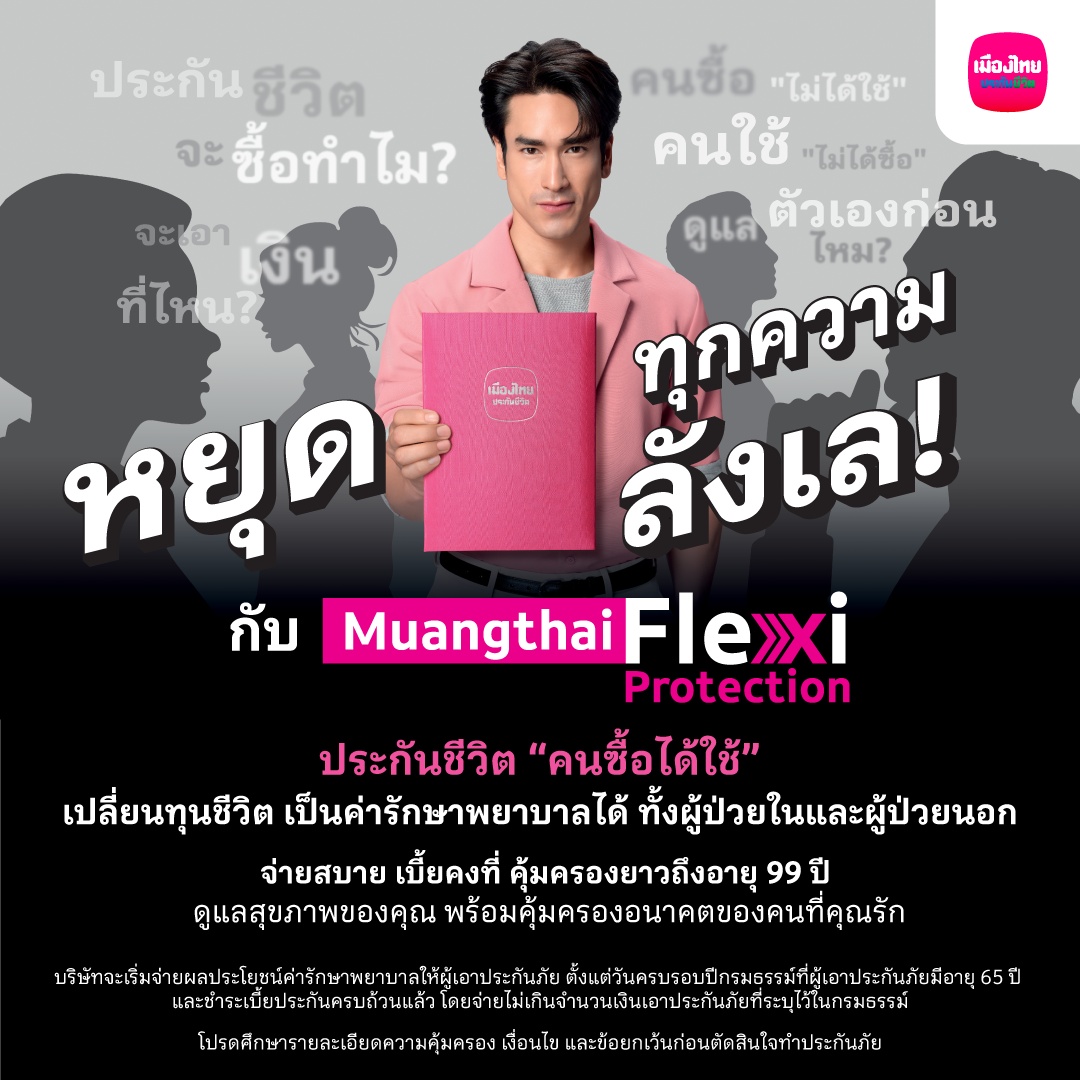 ในยุคที่ผู้บริโภคมักลังเลกับคำถาม “จะซื้อประกันชีวิตไปทำไม ในเมื่อคนซื้อไม่ได้ใช้?” เมืองไทยประกันชีวิต เข้าใจทุกความลังเล และขอ “หยุดทุกความลังเลในหัว” เปิดตัว “Muangthai Flexi Protection” (เมืองไทย เฟล็กซี่ โพรเทคชั่น) ประกันชีวิตที่ “คนซื้อได้ใช้” ให้คุณดูแลสุขภาพของคุณ พร้อมคุ้มครองอนาคตของคนที่คุณรักได้ในกรมธรรม์เดียว สามารถเปลี่ยนทุนชีวิตมาใช้เป็นค่ารักษาในวัยเกษียณได้ทั้งผู้ป่วยใน และผู้ป่วยนอก ทุนประกันที่เหลือส่งต่อให้คนข้างหลังได้ในวันที่คุณไม่อยู่ ตอบทุกเสียงลังเลของคนยุคใหม่ที่ต้องการความคุ้มค่าและยืดหยุ่นในชีวิต ปักธงประกันชีวิตที่ “คนซื้อได้ใช้จริง”